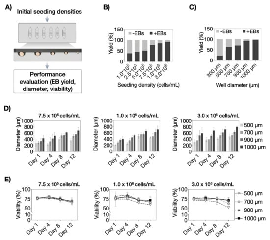 (A) Embryoid body (EB) size pre-screening concept using multi-size biochip array by evaluating EB yield, EB diameter, and EB viability. Average EB production yield at respective (B) initial seeding densities and (C) biochip well diameters during a cultivation period of 12 days in the microfluidic array. (D) EB size separation by different microwell diameters (500–1000 µm) at initial seeding densities of 7.5 × 105 cells/mL, 1.0 × 106 cells/mL, and 3.0 × 106 cells/mL for 12 days post-seeding in the microfluidic device. Statistical significance was tested by using one-way ANOVA, n = 3 ± SD. Bars without * do not represent statistical significance. (E) Time-resolved monitoring of the impact of initial seeding densities and microwell sizes on EB viability, n = 3 ± SD.