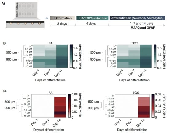 In a final set of experiments, embryoid body size-related effects on neural and astrocytic differentiation were monitored over a total cultivation time of 14 days post-induction with either RA or EC23 inducers. As shown in our differentiation optimization studies (see Figure 3 and Figure 4), a four-day induction period induces earlier astrocytic differentiation upon stimulation was chosen as the standard protocol for all remaining on-chip experiments. To investigate the impact of embryoid body size on neural differentiation, embryoid bodies were generated inside biochips containing representative sizes of 500 µm and 900 µm-diameter microcavities (see also Figure 7A). Results of our comparative analysis are shown in Figure 7B and revealed a gradual increase in MAP2 positive neurons over two weeks, as indicated by a 1.7 ± 0.1-fold change of MAP2 signal for RA (p < 0.001) and 1.6 ± 0.2 (p < 0.001) fold change for EC23 at day 14 for 500 µm wells. Similar concentration-independent effects were observed for embryoid bodies that have been generated in 900 µm sized microcavities (p < 0.05 for RA and EC23). It is important to highlight that embryoid bodies generated and differentiated within 900 µm microcavity displayed significantly higher MAP2 levels than the smaller 500 µm embryoid body size, thus confirming the direct influence of size on cellular differentiation status. In turn, untreated embryoid bodies cultivated in 500 µm microcavities showed no GFAP signal and completely lacked any astrocyte cell population. In contrast, RA and EC23-treated embryoid bodies showed a significant concentration-independent increase of astrocytes (p < 0.01), as shown in Figure S3. These results point at additional spontaneous astrocytic differentiation only in larger-sized embryoid bodies.