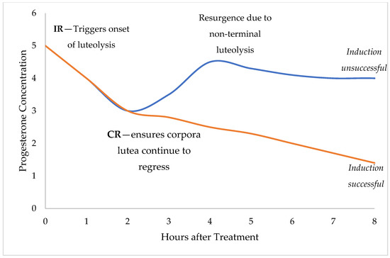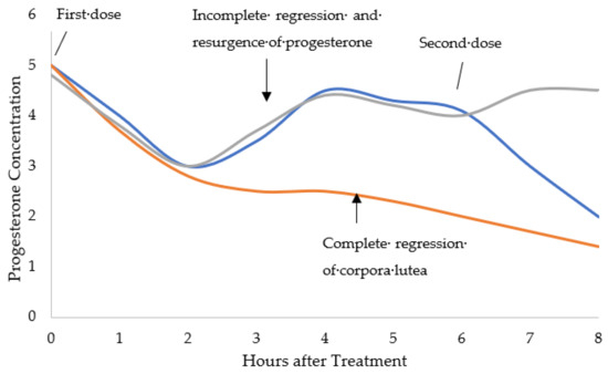 Graphical representation of how progesterone concentrations fluctuate when sows are given a luteolytic agent (i.e., cloprostenol). The first dose can trigger complete regression for successful induction (orange line) or incomplete regression causing an unsuccessful induction (grey line). Administering a second luteolytic dose 6 h after the first should trigger complete regression and result in a successful induction (blue line) [12,13,14].