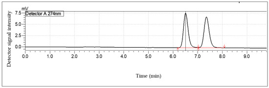Using the method outlined by Kalikova et al. [22], enantiomers were separated and quantified. The separation system consisted of a Lux Cellulose-1 column (Phenomenex, Pty, Ltd., Lane Cove, NSW Australia) acetonitrile-sodium dihydrogenphosphate (pH 3; 20 mM) (1:2, v/v) as the mobile phase. HPLC was performed using a Shimadzu LC system (Shimazu Corporation, Kyoto, Japan) with a column temperature set to 20 °C, a flow rate of 0.7 mL/min, and a wavelength 274 nm. Retention time of cloprostenol was 6.5 min (linearity range: 2.5–30 µg/mL; r2 = 0.99) as presented in Figure 3.