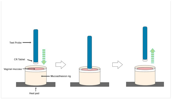 CR tablets were fixed onto a stainless-steel probe with cyanoacrylate adhesive on a hydraulic press. Porcine mucosa was thawed in PSVF (pH 7) at 37 ± 1 °C for 60 min using a magnetic stirrer and heated disk [28] and secured into the mucoadhesion rig suspended in PSVF at 37 °C ± 1 °C. The TA.XTplus texture analyser (Arrow Scientific, Pty, Ltd, Gladesville, NSW, Australia) evaluated bio-adhesion force, with a schematic diagram presented in Figure 4.