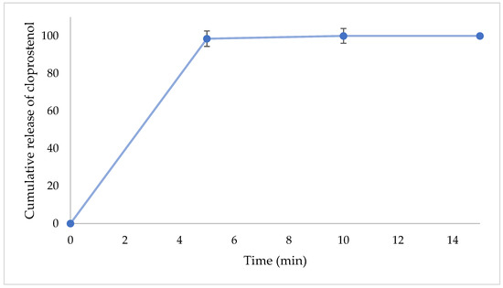 In vitro release profile of cloprostenol IR formulation. Each data point is the mean ± standard deviation of the triplicate.