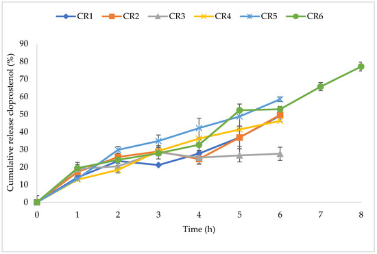 In vitro release profiles of cloprostenol CR NVDDS formulations. Each data point is the mean ± standard deviation of the triplicate. Formulation CR6 displayed favourable release and was assessed over an eight-hour time period.