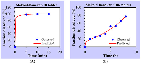 Release profiles of IR tablet (A) and CR6 tablet (B) fitted by Makoid–Banakar model.