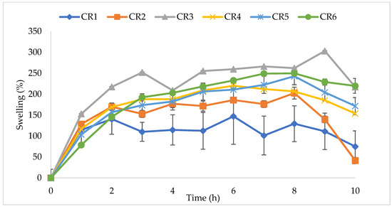 Swelling profiles for controlled release formulations CR1–CR6. Each data point is the mean ± standard deviation of the triplicate.