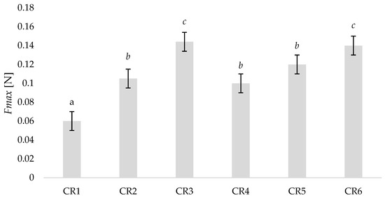 Mean detachment force Fmax (Newtons) for controlled release formulations CR1–CR6 as measured by a TA.XTplus texture analyser (n = 3). Formulations with significant differences in mean detachment force (at the 95% level of confidence; p-value < 0.05) are represented by different superscripts (a, b or c).