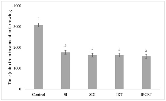 All sows receiving cloprostenol, regardless of dose or route of administration, had shorter intervals to farrowing than the control sows (p = 0.001). The average times to farrow after treatment administration were all within the 23–32 h expected for successful farrowing induction [14]. No significant differences were observed between sows that were induced by injection or IM and CR tablets (Figure 11). Sows that received a single injection of cloprostenol had the same induction success rate as those that received a split dose.