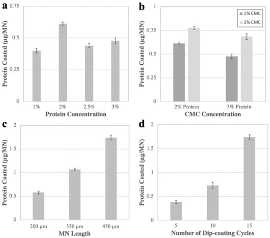 The aqueous coating solution consisted of the peanut protein, CMC, and Pluronic F-68. While the Pluronic concentration was kept constant at 0.5% (w/v), the antigen concentration was varied from 1% to 3% (w/v), and the CMC concentration from 1% to 2% (w/v). Increasing protein concentration from 1% to 2% nearly doubled the amount of antigen loading (to ~0.6 µg/MN), but higher concentrations did not significantly improve the loading (Figure 2a). We did not pursue protein concentrations above ~2%, because they formed a highly viscous, hard-to-mix coating solution that yielded unreliable coating results (data not shown). For CMC, a 2% (w/v) concentration afforded a greater antigen loading compared to 1% (w/v), probably because the increased coating solution viscosity kept more coating solution on the MN surface during drying (Figure 2b).