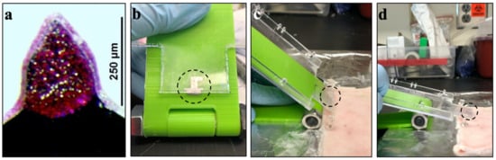 Device for angled MN insertion. (a) Representative MN coated with peanut protein and sulforhodamine B dye to facilitate imaging; (b) biplanar insertion device with MN array (circled) attached to solid surface that slides at a predetermined angle; and (c,d) device used to insert MN array into pig skin ex vivo at 45° and 20°, respectively.
