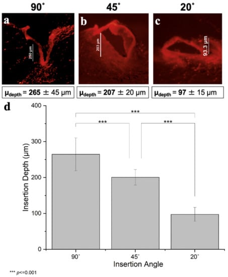 Further decreasing the insertion angle to 20° lowered insertion depth to 97 ± 15 µm (Figure 4c), which is in the range of human epidermal thickness (~100 µm), thus suggesting a viable way to increase the extent of epidermal targeting with MNs. In addition, this insertion depth is not significantly different from the calculated depth of 85 µm (within 95% confidence interval of 83–112 µm). Fluorescence images of all nine replicates for each of the three angles reported can be found in Supplementary Materials Figures S2–S4.