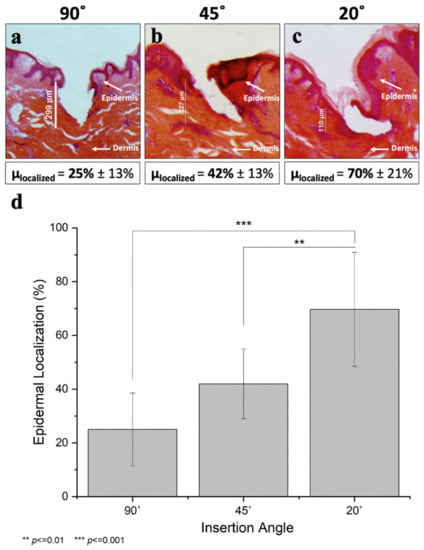 We found that decreasing the insertion angle significantly increased epidermal targeting (one-way ANOVA, p < 0.001; see Figure 5 and Supplementary Materials Table S1). Perpendicular insertion only afforded 25% ± 13% localization in the epidermis (Figure 5a), whereas reducing the insertion angle to 45° improved this localization nearly twofold (42% ± 13%, Figure 5b). Acute angle insertion at 20° further increased epidermal targeting to 70% ± 21% (Figure 5c). H&E-stained images of all nine replicates for each of the three angles reported can be found in Supplementary Materials Figures S6–S8.