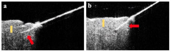 Representative OCT images of MNs inserted into skin at an angle. The MNs appear as a bright line that extends from the top right into the skin (red arrow). The light region on the lower left is skin. The dark region on the lower right is skin that is shadowed by the MN and therefore cannot be seen. The skin is oriented with the stratum-corneum-side up. (a) MN inserted at 20°. Yellow scale bar (100 µm) shows a MN insertion depth of approximately 100 µm. (b) MN inserted at 45°. Yellow scale bar (100 µm) shows a MN insertion depth of close to 200 µm.