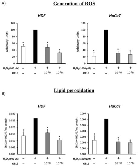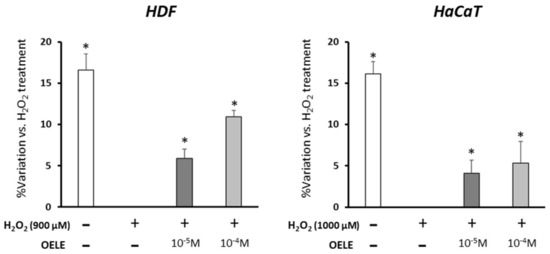 3.4. Olea europaea Leaf Extract Increases the Viability of HDF and HaCaT Cultures Exposed to Oxidative Stress
