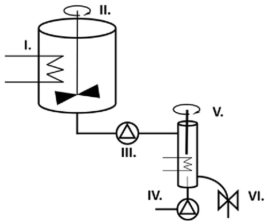 The foaming device contains six main parts. The heated melting vessel (I) and IKA EURO-ST D stirrer (II) are responsible for the homogenous molten suspension that is transferred to the heated foaming cell (IV) by a peristaltic pump (III). The added gas is dispersed by the ULTRA-TURRAX (V) in the melt and dosed by a pinch valve (VI).