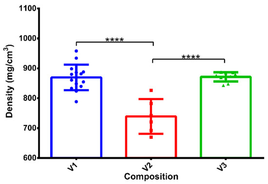Densities of compositions V1-V3. V2 had the significantly lowest density value. **** indicates statistically significant differences at p < 0.0001. The measured values, average values, and standard deviations are presented (n = 20).