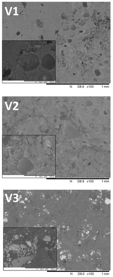 Scanning electron microscopy images of the broken surfaces of V1, V2, and V3. Different locations of the API i can be observed in different matrices. The insets show magnified images of the cavities with verapamil crystals. In V1 and V2, verapamil particles were dispersed through the matrix, while in V3, the white verapamil crystals appeared in the inner surfaces of the cavities. The scale bar of the insets is 200 µm.