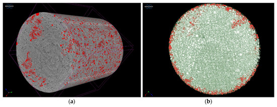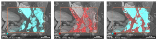 The reconstructed model of the foam structure shows a closed spheroid cell structure, but some of the bubbles (bubbles marked with red) can be observed at the edges open to the surface. Some of them form a cavity system in the matrix, although their number is small compared to the whole matrix (Figure 7).