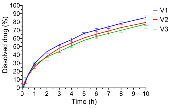 The dissolution test showed prolonged drug release for up to ten hours in all cases (Figure 5). Flotation was checked visually, and no drugs sunk before the end of the test. The V1 composition reached the highest dissolution rate of 85.3%, while V2 and V3 reached lower values of 79.4% and 77.4%. When the dissolution efficiencies were determined, it was found that V1 showed the fastest release with a value of 70.03%, while for V3, the DE value was only 68.43%. The kinetic profiles are summarized in Table 3. All compositions fitted the best to first-order kinetics pattern; however, V2 fitted best with the target zero-order kinetics (the correlation coefficient was 0.7572). As V2 showed the best properties, this composition was mainly examined in further experiments.