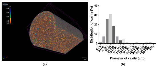 Reconstructed micro-CT image of the V2 composition (a) and cavity size distribution (b).