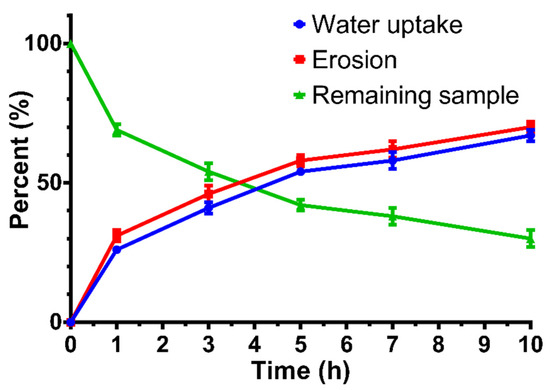 Water uptake, erosion, and remaining sample (%) vs. time (h) curve of the V2 compositions. Bars represent mean ± S.D. (n = 3).