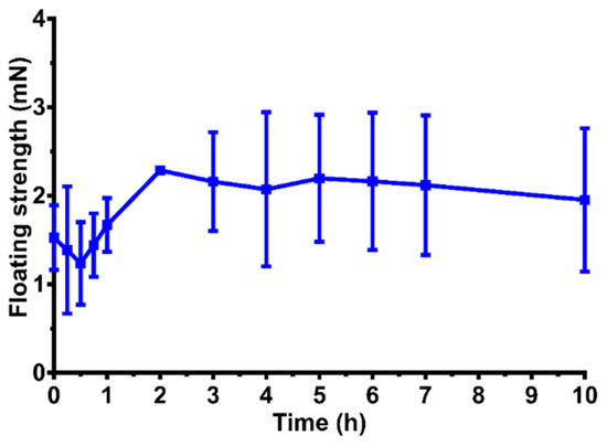 At the zero-time point, the sample was able to float on top of the acidic media and generate a buoyancy force of 1.5 mN. During the swelling and erosion of the capsule shell, the buoyancy decreased to 1.2 mN. Then, it started to increase and entered a plateau phase at around 2 mN until the API was completely released (Figure 10).