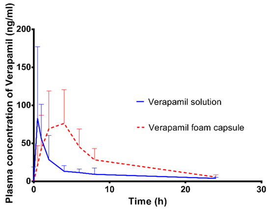 Mean plasma Verapamil–HCI concentrations and standard deviations after a single oral dose of the reference solution and foam capsule were administered to beagle dogs (n = 6).
