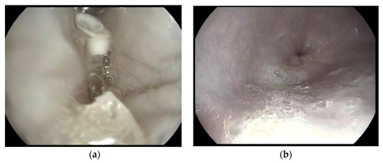Gastroscopy was performed, and gastric retention after two hours was proven (Figure 12a). After 4 h, the capsule was eliminated from the stomach (Figure 12b).