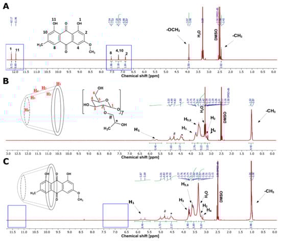 The 1H NMR investigations for free and complexed PTN were performed to explore the possible inclusion mode of the PTN/HP-β-CD complexes [38]. Accordingly, we compared the NMR spectra of free PTN, pure HP-β-CD, and the PTN/HP-β-CD complexes. As illustrated in Figure 2A, pure PTN in DMSO-d6 showed peaks corresponding to the methyl and methoxy protons at 2.4 and 3.91 ppm, respectively. In addition, the aromatic ring protons exhibited their corresponding peaks at 6.8, 7.1, and 7.5 ppm. The intense peaks at 11.9 and 12.1 ppm corresponded to the phenolic protons on each side of the anthraquinone structure [39]. Figure 2B indicated the prominent peaks of pure HP-β-CD in DMSO-d6, showing the primary chemical shifts for H-1 to H-6 protons between 3 and 6 ppm except for the methyl protons that appeared at 1 ppm. The inclusion of PTN into HP-β-CD resulted in the disappearance of the PTN’s aromatic and hydroxyl protons between 6.5 and 12 ppm, as annotated in Figure 2C. Moreover, the methyl and methoxy protons entirely vanished at 2.4 and 3.9 ppm.