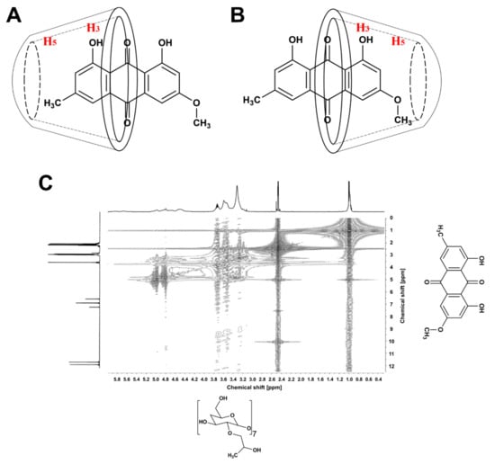 The possible penetration patterns of PTN through the HP-β-CD cavity by either the methyl (A) or the methoxy (B) substituted rings. (C) ROESY spectrum of the PTN/HP-β-CD complexes in DMSO-d6.
