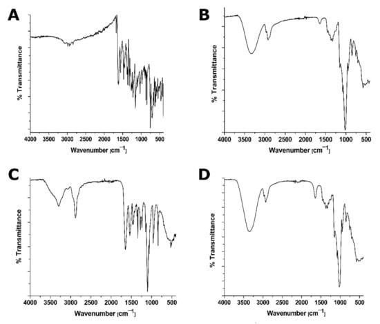 The FT-IR measurements were performed by a Brucker α-alpha FT-IR instrument (Bruker Optic, Ettlingen, Germany) with an attenuated total internal reflectance diamond crystal. The neat solid samples were placed directly on the diamond crystal, after which the adjustable pressure arm was positioned over the sample to press it gently. FT-IR spectra were recorded in the transmission mode from 4000 to 400 cm−1 [36].