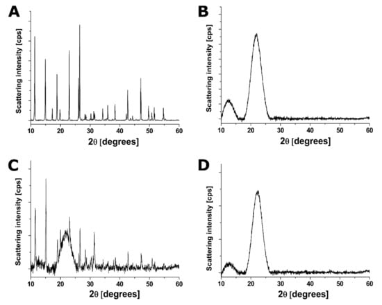 Powder X-ray diffraction patterns of (A) PTN, (B) HP-β-CD, (C) physical mixture (1:1 molar ratio of PTN and HP-β-CD), and (D) PTN/HP-β-CD complexes. Scanning angle of 2θ = 10–60; step width of 0.03°/min.