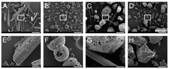 SEM micrographs recorded at an acceleration voltage of 10 kV of (A) PTN, (B) HP-β-CD, (C) physical mixture (1:1 molar ratio of PTN and HP-β-CD), and (D) PTN/HP-β-CD complexes with the respective magnification (E–H) corresponding to the white rectangle. Scale bars represent 200 µm in (A–D) and 30 µm in (E–H).