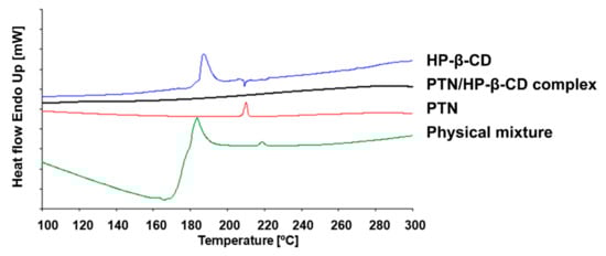 DSC is widely used to characterize the inclusion of active moieties in the CD cavity by a shift or disappearance in the melting point of the guest molecules [45]. Figure 7 displays that pure PTN exhibits a sharp endothermic peak at 210 °C corresponding to its melting point, indicating its crystalline nature, which is well-matched with previous reports [39,46]. As reported before, the pure HP-β-CD showed a broad peak at 187 °C because of water loss from the cyclodextrin cavity at higher temperatures [47]. As clearly evidenced in Figure 7, the physical mixture thermogram was quite different from that of the pure components. In the physical mixture, the PTN peak was reduced in intensity and shifted to a higher temperature (218 °C), while HP-β-CD shifted to a lower temperature (183 °C) in comparison to the pure HP-β-CD (187 °C). This may be due to interactions during the DSC run, at least within the ~100–180 °C temperature range, and agrees with a previous study attributing these slight peak shifts to the weak interaction between the cyclodextrin and drug during the physical mixture preparation [48].