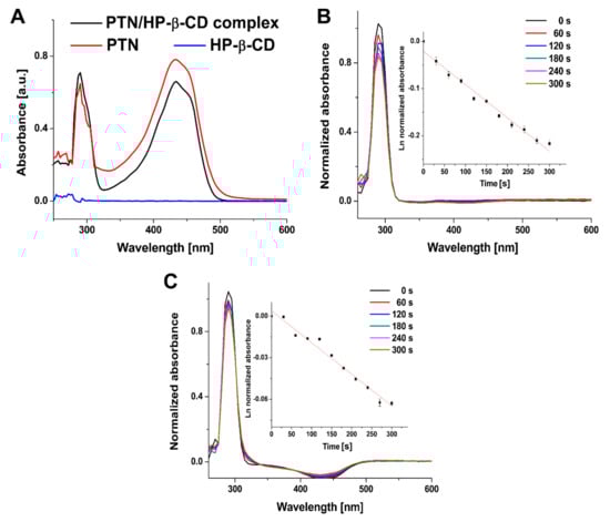 (A) UV/Vis spectra of PTN in ethanol (80 µg/mL), HP-β-CD in water (0.5 mg/mL) and PTN/HP-β-CD inclusion complexes in water (80 µg/mL). (B,C) Absorption spectra of uric acid upon irradiation for different times in the presence of (B) free PTN and (C) PTN/HP-β-CD complexes. The insets represent the plot of Ln normalized absorbance of uric acid at λ = 296 nm versus irradiation time in s (λirr = 457 nm, irradiance = 220.2 W/m2). All measurements were performed in triplicate, and the values were expressed as means ± SDs (n = 3).