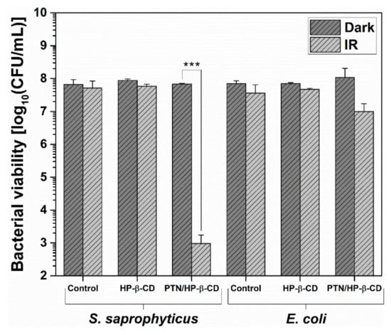 Bacterial viability of Staphylococcus saprophyticus subsp. bovis (S. saprophyticus) and Escherichia coli DH5 alpha (E. coli) treated with PTN/HP-β-CD complexes (100 µM PTN) or only with HP-β-CD for 30 min at 37 °C and then irradiated (IR) with a blue LED (λirr = 457 nm, 39.6 J/cm2) or kept in the dark. Control represents bacterial suspension treated with filter-sterilized phosphate-buffered saline (PBS) (pH 7.4). The results are expressed as means ± SDs (n = 3). Statistical differences are denoted as “***” p < 0.001.