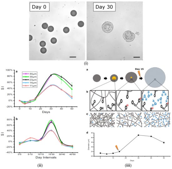 (i) Microparticle (44 μm) swelling changes over time, on day 0 and swollen microparticles (79 μm) on day 30. (ii) Swelling kinetics: (a) Complete swelling index (SI) changes from day 0. (b) Swelling changes between each incubation time interval. (iii) Interplay of expansive intermolecular forces: (a) Schematic of microparticle swelling over time. (b) Insets represent the hydrolysis, degradation, hydration shell, and swelling that occurs over time in terms of active chemistry. (c) General view of water ingress over time and subsequent hydrolysis of the polymer, (d) Swelling profile timeline as it correlates with the schematic (taken from 23 μm population data) [50].