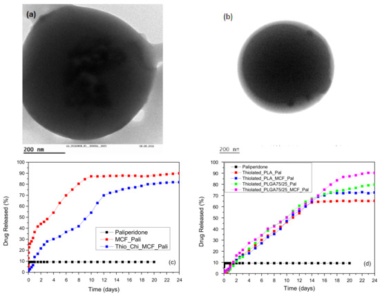 TEM images of microspheres: (a) Thiolated_PLA_MCF_Pal and (b) Thiolated_PLGA75/25_MCF_Pal and dissolution profile of (c) neat paliperidone, MCF loaded drug and thiolated CS microspheres, and (d) drug release profile from PLA- and PLGA-coated microspheres with thiolated chitosan [60].