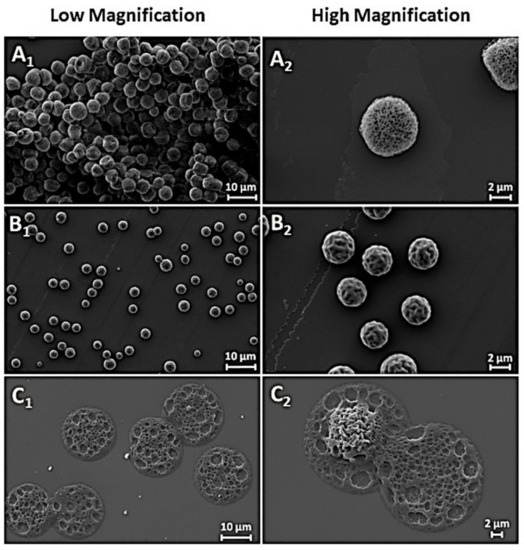 Tasci et al. also worked beyond conventional methods of polymeric microparticle manufacturing in order to overcome some of their drawbacks, such as, for example, the time-consuming experimental procedures, among others. In their case, the electrospray method was used [18]. The formation of particles was performed using PLA solutions of three different organic solvents, namely dichloromethane, chloroform, and chloroform–ethanol mixture. The sizes and morphology of the prepared microparticles were optimized via well-controlled flow rates, applied voltages, and solvent concentration. It has been shown that DCM was the most suitable solvent for obtaining microparticles of a uniform spherical shape with an average diameter of 3.00 µm, and a highly porous structure (Figure 6).
