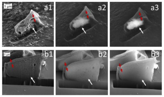 FIB-SEM cross-sectional image of capsules filled with (a) FeCl2 crystals and (b) Fe3O4 nanopowder obtained with (1) SE, (2) BSE detector, and (3) overlaid image. White arrows indicate the cargo crystals inside the capsules, while red arrows indicate the shell polymer layer [64].