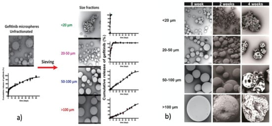 PLGA microspheres loaded with the gefitinib drug were prepared using an oil-in-water solvent evaporation method, obtaining different particle sizes of 5 ± 1, 32 ± 4, 70 ± 3, and 130 ± 7 μm [71]. Encapsulation efficiency of gefitinib, loading content, and microspheres yields are all increasing by increasing the particle size of prepared microspheres. In vitro drug release studies showed that microspheres with sizes smaller than 50 μm have a rapid diffusion-based release, reaching completion within 2 days. For such low particle sizes, their high surface area per unit volume leads to a higher rate of water permeation and thus to higher matrix degradation rates (Figure 9a). Larger microspheres, however, showed a sigmoidal release pattern that continued for three months in which diffusion (early stage), as well as particle erosion (later stage) governed drug release (Figure 9b). Therefore, it is clear that the two main mechanisms that drive drug release from PLGA microspheres are diffusion and degradation/erosion [72].