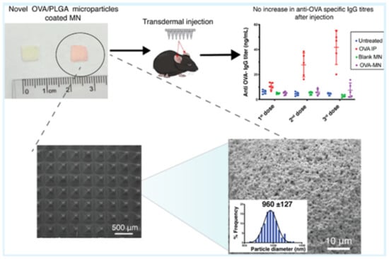 Novel OVA/PLGA coated MN microparticles for transdermal application, with the particle size distribution. Adapted with permission from ref. [75]. 2020, ACS Publications.