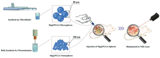 Zhou et al. investigated the controlling factors for cytotoxicity, photothermal, and anti-tumor effects of biodegradable magnesium poly(lactic-co-glycolic acid) (Figure 12), in vitro and in vivo. MgPLGA microspheres were made by microfluidic emulsification and demonstrated high Mg encapsulation efficiency, 87%. The photothermal and anti-tumor effects of MgPLGA spheres were determined by their Mg content, irrelevant to their structural features and size, as shown in in vitro cell assays and in vivo mice models. These results provided important implications for designing and fabricating stimuli-responsive drug delivery vehicles [90].