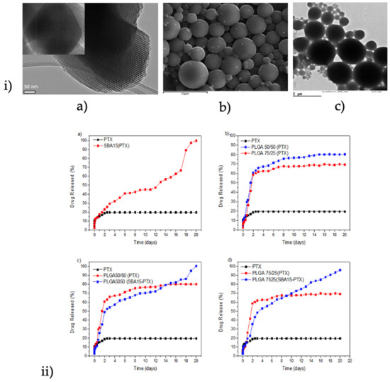(i): (a) TEM micrographs of the parent SBA-15 mesoporous silica (b) SEM micrographs of PLGA 50/50 w/w microparticles (c) TEM micrographs of PLGA 50/50 w/w microparticles loaded with PTX/SBA-15, low magnification (ii) in vitro release of PTX (a) from SBA-15, (b) PLGA 50/50 and 75/25 w/w, (c) PLGA 50/50 w/w, PLGA 50/50 w/w loaded PTX/SBA-15, and (d) PLGA 75/25 w/w, PLGA 75/25 w/w loaded PTX/SBA-15. Adapted with permission from ref. [92]. 2021, Elsevier.