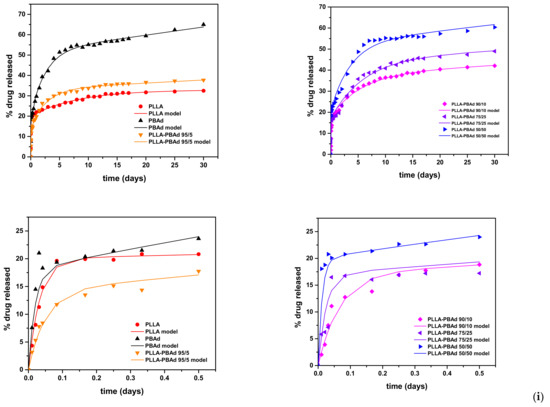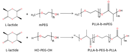 Amphiphilic biodegradable and bioresorbable microparticles consisting of hydrophilic-hydrophobic parts have gained significant attention across multiple fields of biochemistry for direct drug delivery because of their useful rheological, biomedical, and mechanical properties. Amphiphilic copolymers tend to self-assemble into core-shell micelles with a hydrophobic center and a hydrophilic external surface in aqueous solution. PLA’s high hydrophobicity makes it an excellent biomaterial for such applications, while poly(ethylene glycol) (PEG) is a biocompatible hydrophilic polymer used extensively in many applications in pharmaceutical technology. Such poly(l-lactide)/poly(ethylene glycol) (PLLA/PEG) copolymers can be easily prepared by ring opening polymerization of lactide in the presence of PEG and a catalyst, usually stannous octoate [93]. Hydroxyl end groups can act as initiators for lactide polymerization, and according to this procedure diblock or triblock copolymers can be prepared. Ding et al. synthesized such amphiphilic PLLA/PEG copolymers (Figure 14) with various molecular weights for the delivery of ibuprofen (IBU), used for the treatment of a range of aches and pains [94]. Studies showed that by increasing the Mw of PEG, the encapsulation efficiency and drug loading content and of IBU were improved significantly in the PLLA-PEG micelles. Another interesting application of PLA-PEG diblock copolymer is the treatment of retinal diseases. Rafat et al. [95] encapsulated the Tat-EGFP protein (Tat; protein transduction of HIV-1 trans activator of transcription protein), which can effectively circumvent the retina’s barriers. Four different ratios of PEG–PLA microparticles were developed by changing the ratio of the protein and the polymer. The microcapsules exhibited a burst release profile in the first days. As the polymer concentration was increased to a constant protein concentration, the release rate was reduced.