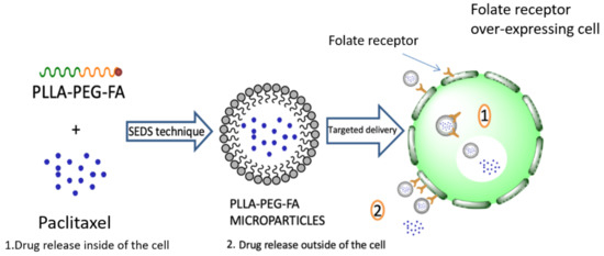 Another interesting application of these copolymers is for cancer treatment. PEG can be used to modify microparticle surfaces in order to avoid their recognition by cells of the mononuclear phagocyte system, thus leading to an increased blood circulation time of microparticles [98]. These PLA/PEG amphiphilic carriers exhibit prolonged blood residence after their administration (long-circulating drug carriers), as well as passive targeting of tumors due to the leaky vasculature of many tumors and the ‘enhanced permeability and retention’ (EPR) effect [99,100]. Nevertheless, nanoparticles prepared from copolymers with high molecular weight PLA blocks exhibited longer blood circulation times after i.v. administration in rats than the nanoparticles prepared from copolymers with low molecular weight PLA blocks [101] and have been used extensively as drug delivery Microparticles (Table 3). Additionally, from in vivo studies performed in mice, it was found that blood circulation time could be increased by increasing the molecular weight of the PEG blocks in diblock PEG-PLGA copolymers, from 5000 to 20,000 g/mol [102]. These copolymers have long been established as ideal carriers for anticancer drugs [103,104,105]. Despite the generally positive outcomes, therapeutic agents have several drawbacks, including weak pharmacokinetics, unspecific bio-distribution, and limited targeting efficiency. When therapeutic agents are used in cancer treatment, low solubility and hydrophobicity are considered significant obstacles [106]. To overcome them, anticancer drugs, such as paclitaxel and doxorubicin, are encapsulated in amphiphilic copolymer micelles, such as PEG/PLLA. Huang et al. [107] used folic acid (FA) in conjunction with PEG terminal groups to form FA-PEG-PLLA for tumor targeted therapy (Figure 15). Owing to the overexpression of FA receptors in many cancer cell types, folic acid is one of the most commonly used targeting ligands [108]. Microparticles loaded with paclitaxel (PTX) were prepared using the solution-enhanced dispersion by supercritical fluids (SEDS) technique with CO2 used as the supercritical fluid. The diameters of most of the particles were 1–3 μm, with a spherical shape and slight agglomeration.