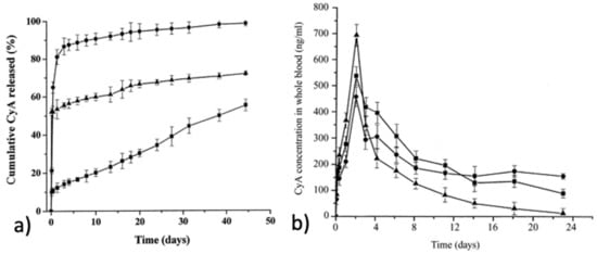 - Li, Y.; Zhu, K.J.; Zhang, J.X.; Jiang, H.L.; Liu, J.H.; Hao, Y.L.; Yasuda, H.; Ichimaru, A.; Yamamoto, K. In Vitro and in Vivo Studies of Cyclosporin A-Loaded Microspheres Based on Copolymers of Lactide and ε-Caprolactone: Comparison with Conventional PLGA Microspheres. Int. J. Pharm. 2005, 295, 67–76. [Google Scholar] [CrossRef]