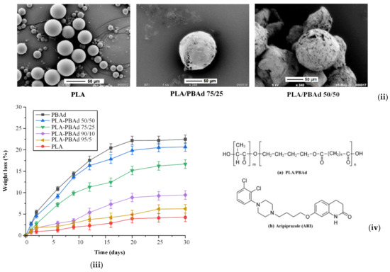 In general, the molecular weight of PLA is a crucial factor during the encapsulation process of active ingredients. In that sense, Chaiyasat et al. worked on the encapsulation of Vitamin E on poly(l-lactic acid) (PLLA) microspheres prepared by the oil-in-water emulsion/solvent evaporation technique, while changing the PLLA/Vitamin E weight ratio and also by using different molecular weights of PLLA [58]. It was found that the optimum ratio for the formation of microparticles was 25:1 PLLA/Vitamin E, whereas low molecular weight PLLA exhibited a poorer carrier capacity compared to higher molecular weight PLLA that could better envelop the vitamin in its interior.