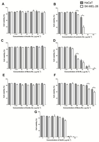 The effect on HaCaT and SK-MEL-28 cell viability when treated with (A) acidic sophorolipids at 0–100 μg mL−1; (B) lactonic sophorolipids at 0–100 μg mL−1; (C) mono-rhamnolipids at 0–100 μg mL−1; (D) di-rhamnolipids at 0–100 μg mL−1; (E) acidic sophorolipids at 0–500 μg mL−1; (F) mono-rhamnolipids at 0–500 μg mL−1; (G) SLES at 0–100 μg mL−1. Data are the mean results of three independently conducted experiments, each with six replicates per treatment group. Error bars show standard error from the mean. Statistical significance was determined using a two-way ANOVA followed by Bonferroni pos hoc test, * = p ≤ 0.05.