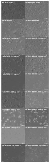 Light microscopy images of HaCaT and SK-MEL-28 cells untreated (0 μg mL−1) or following 24 h of treatment with a vehicle control (MeOH), acidic sophorolipid (ASL) (100 μg mL−1 and 500 μg mL−1), lactonic sophorolipid (LSL) (100 μg mL−1), mono-rhamnolipid (MRL) (100 μg mL−1 and 500 μg mL−1), di-rhamnolipid (DRL) (100 μg mL−1) and SLES at (100 μg mL−1). Images were randomly selected from three independently conducted experiments with each treatment group imaged three times; scale bar is 100 μm.