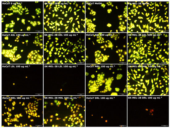 Dual AO/PI staining is a technique for morphologically assessing necrosis or apoptosis-associated changes in the membrane and nuclei of cells after exposure to a source of injury. Acridine orange is membrane permeable and stains cell nuclei green. Propidium iodide is membrane impermeable and will only stain cell nuclei with compromised membrane integrity as red or orange. Thus, while green condensed and fragmented chromatin are the morphological hallmarks for apoptotic cells, necrotic cells retain red/orange coloration with nuclei morphology similar to that of viable cells (no condensed chromatin), but disrupted cell membrane integrity []. Here, we used a fluorescence microscope to morphologically assess the pattern of cell death induced by glycolipids in HaCaT and SK-MEL-28 melanoma cell line. We observed that there were no significant differences in cell population and morphology of both HaCaT and SK-MEL-28 melanoma cell line between the untreated control (0 μg mL−1), vehicle control and up to 100 μg mL−1 treated concentrations of acidic sophorolipids and mono-rhamnolipids (Figure 3). However, lactonic sophorolipids and di-rhamnolipids treatments up to 100 μg mL−1 concentrations resulted in a significant reduction in cell population for both HaCaT and SK-MEL-28 melanoma cell line with red/orange granular nuclei stains detected in the very few remaining adherent cells, which had their membranes disrupted (necrotic cell death) (Figure 3). Moreover, increasing the concentration of mono-rhamnolipids up to 500 μg mL−1 resulted in a similar trend but with a much higher cell population, whereas cells treatment with acidic sophorolipids at the same concentrations remained unaffected (Figure 3). Treatment with SLES resulted in necrotic cell death in both cell lines at a concentration of 100 μg mL−1, highly similar to that which was observed for cells treated with lactonic sophorolipids (Supplementary Figure S2).